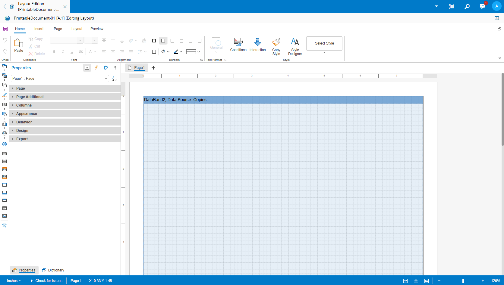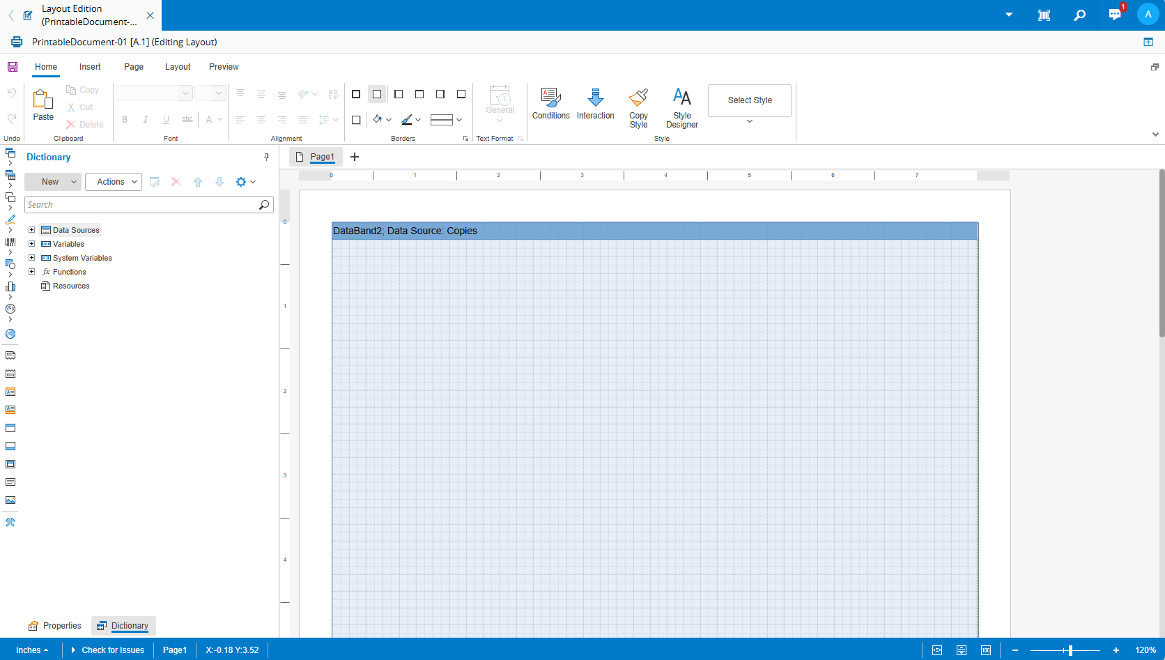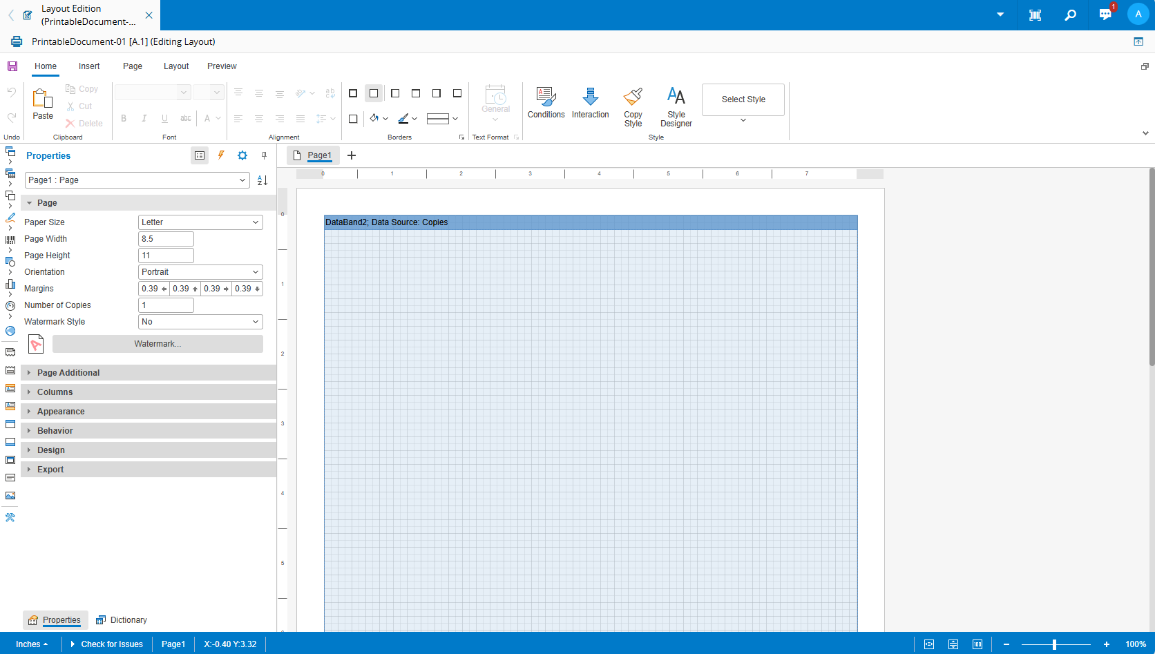 The default layout (used when a new Printable Document is created), is composed of a single page containing a single Data Band with a few properties set, such as: