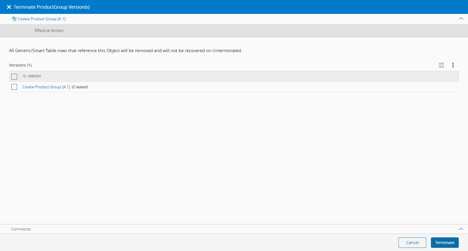 1. Select Terminate to perform the operation. All generic/smart table rows that reference the current object will be removed and will not be recovered if the object is unterminated at a later point.