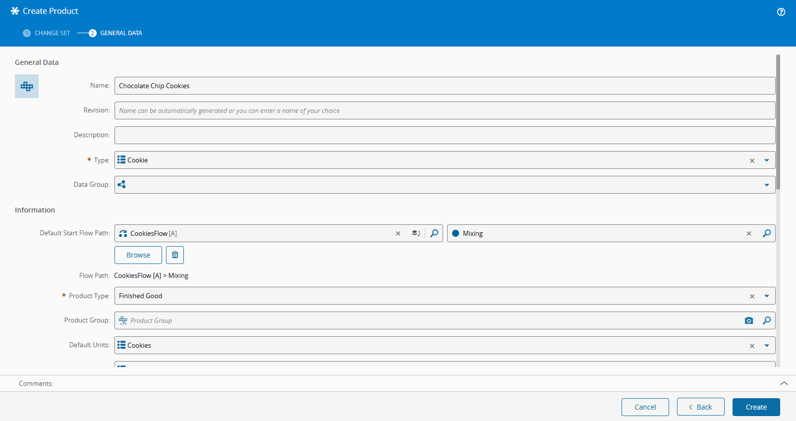 - Optionally, specify a Default Start Flow Path where Materials created with that Product should be placed.