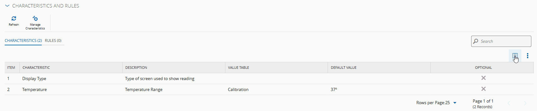 The Manage Characteristics wizard can be called from the Product page by selecting Characteristics and Rules from the section menus on the right, and then selecting the Characteristics tab.