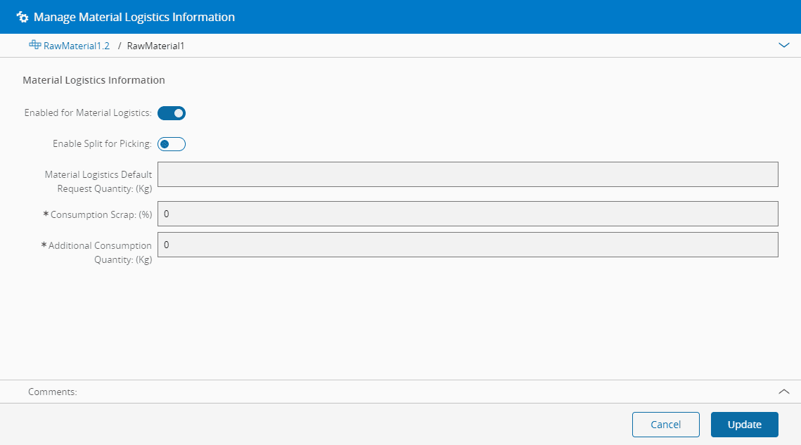1. Specify if the current Product is enabled for Material Logistics. Setting the flag will open up further configuration options.