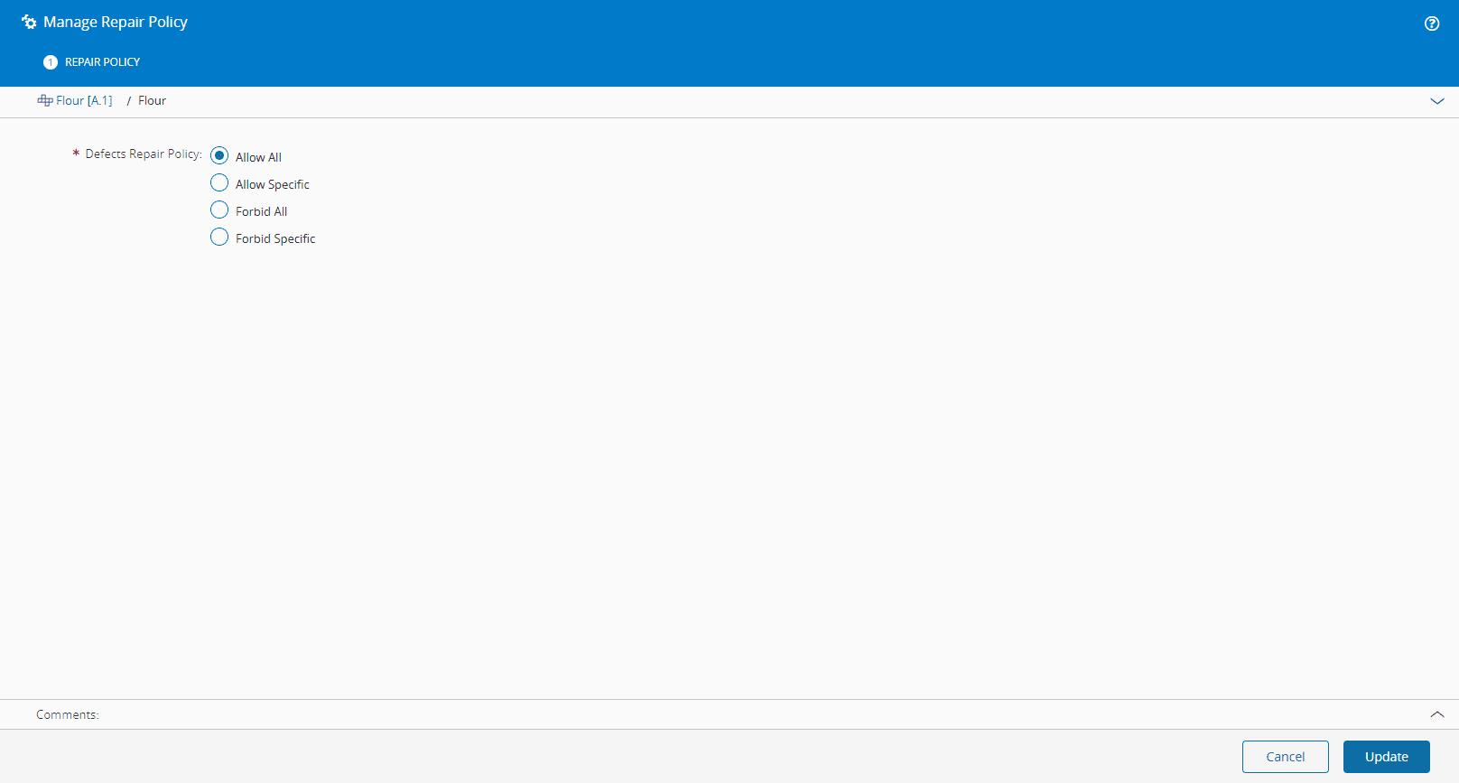 This operation is used to manage the Repair Policy of the Product by defining which type of defects can be repaired or not.
