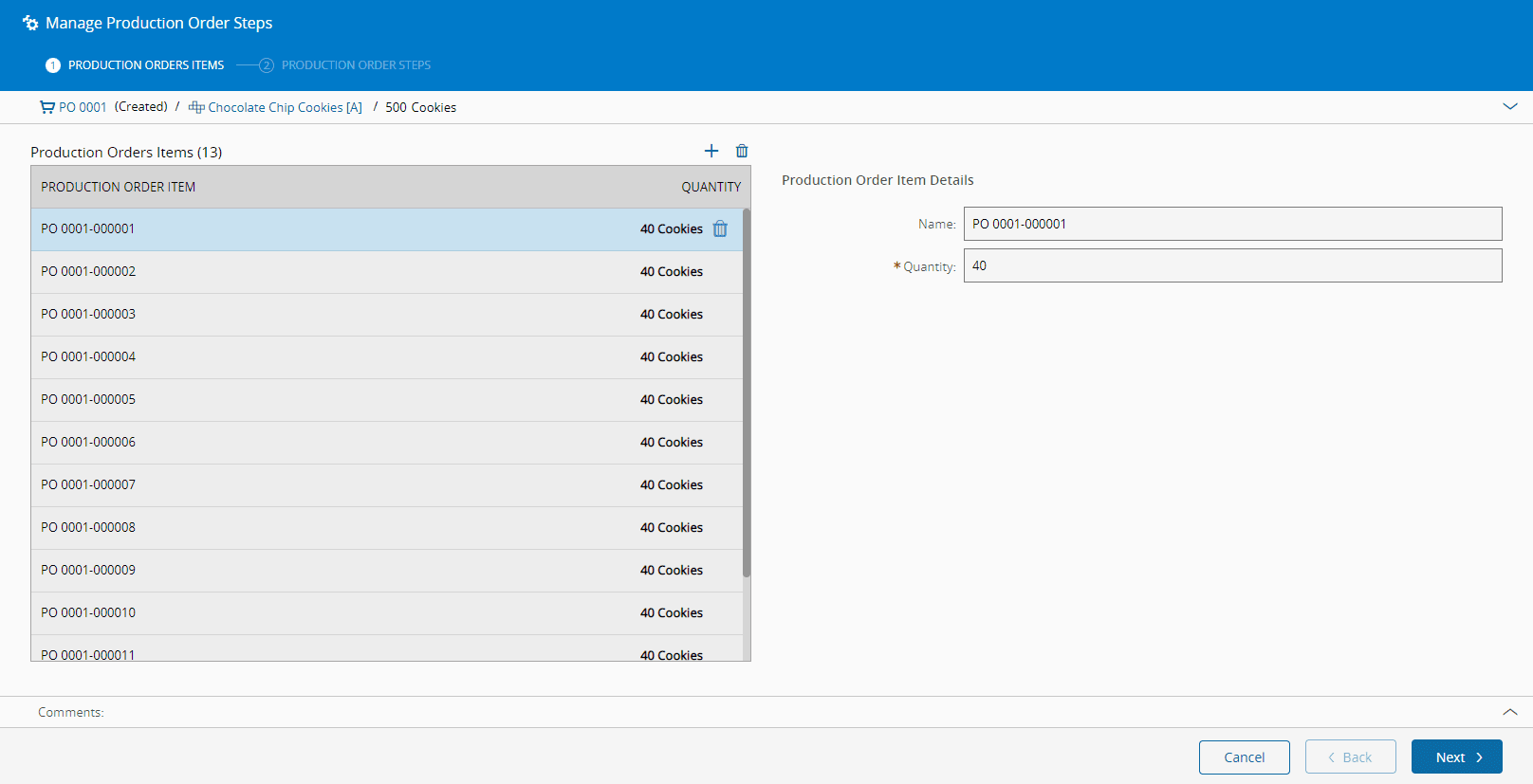 1. For each of the Production Order Items added in the previous step, add as many Production Order Steps as needed (select in the top right of the grid to add, and to remove). You can order the entries with the and arrows, review the information already provided (Production Order Item, Quantity, Production Order Step Name and Item Order) and provide the following information for each Production Order Step: