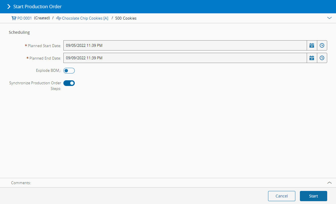 true, Scheduling Mode isProduction Orderand the Production Order has the Include In Planning =true, choose whether to perform a synchronization of the Production Order Steps through which this Production Order will be fulfilled. For more information, see Synchronize Production Order Steps. - Select Start to complete the transaction.
