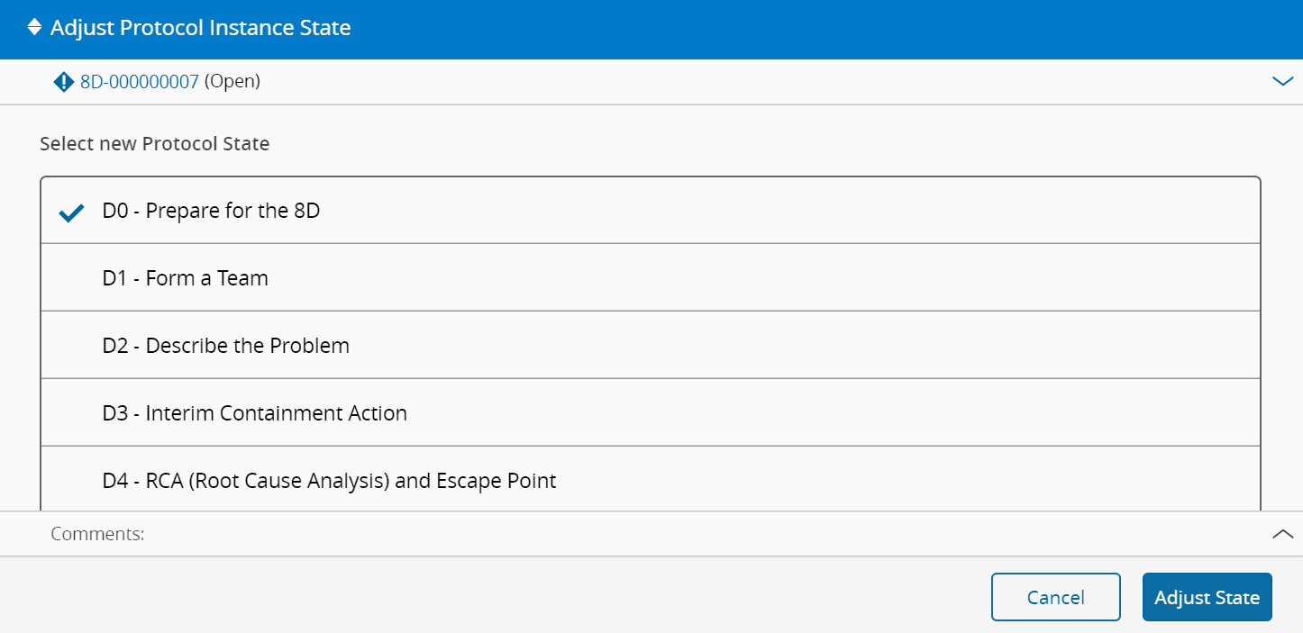 This operation is used to change the state of the Protocol Instance without skipping the restrictions. The Protocol Instance can be changed to any state, even if not following the defined state flow.