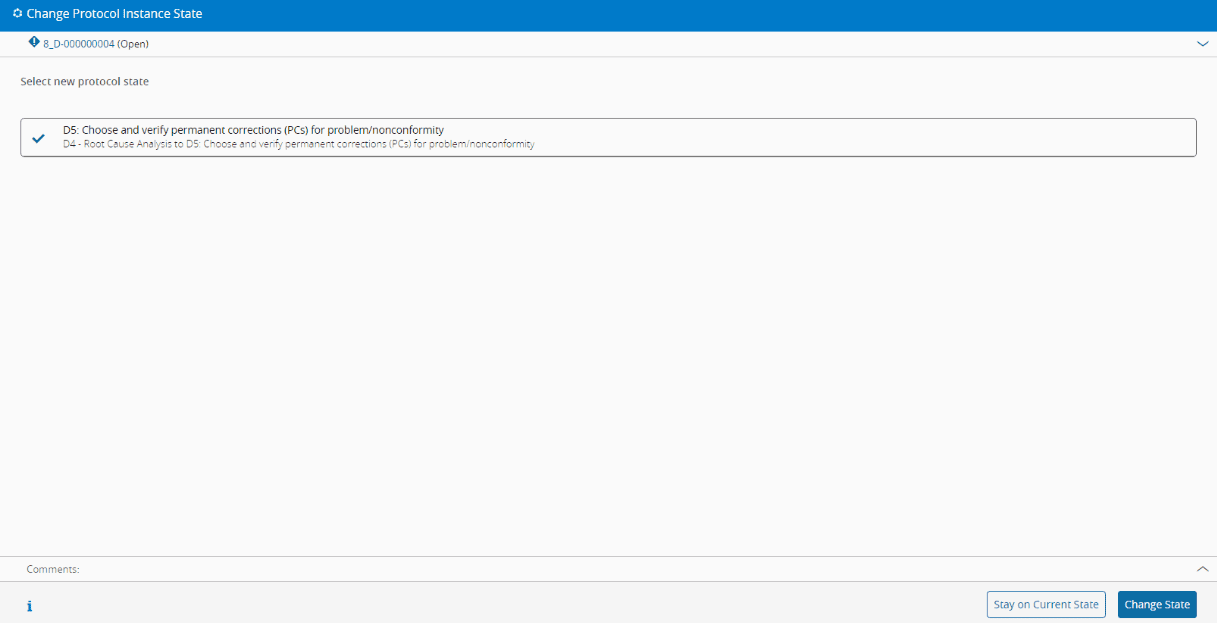 - Press the Change State button and select the next state of the Protocol Instance.