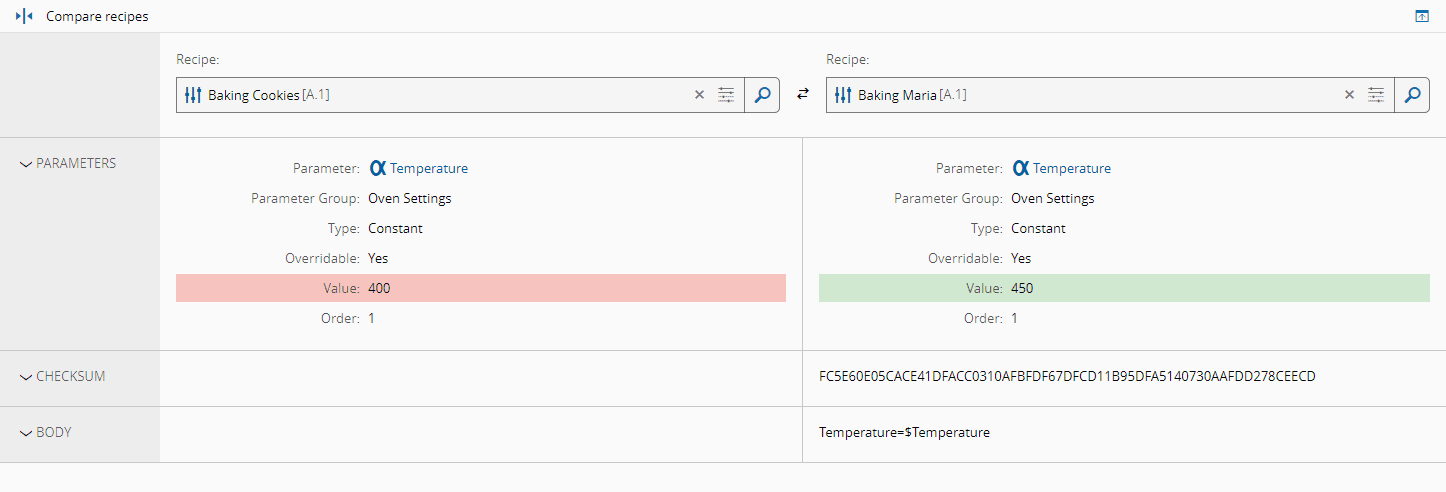 - Choose two Recipes to compare. By default, the Recipe whose Compare Recipe View was opened is chosen for the first Recipe Position.
