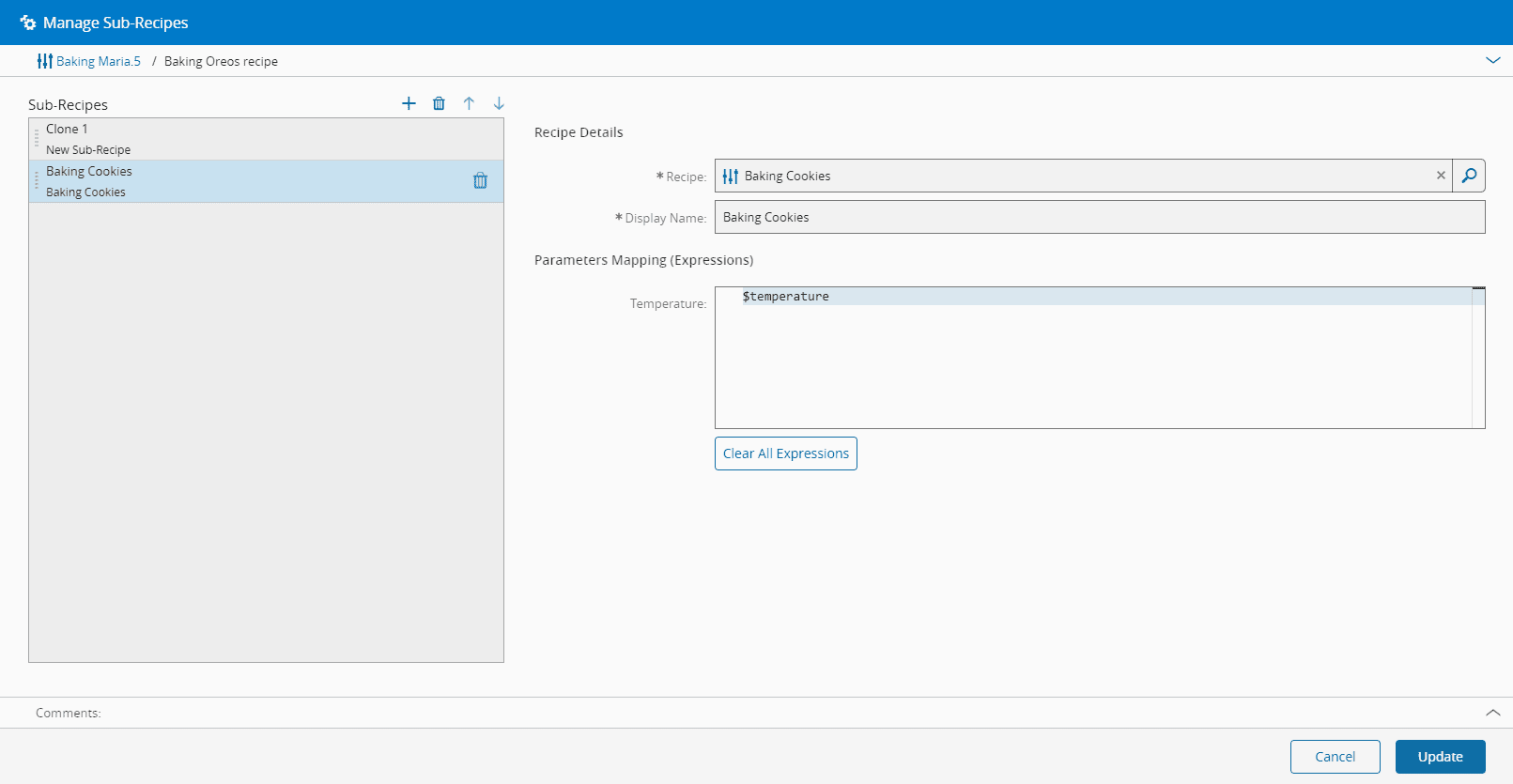 - For each Sub-Recipe, it's necessary to define the Parameter mapping for the Sub-Recipe Parameters which are of type Input and have no default value. For the Sub-Recipe parameters which are overridable, it's possible, but not mandatory, that the Sub-Recipe Parameters mappings are defined as well. A Parameter mapping is based on an expression that refers to the Parent Recipe Parameters.