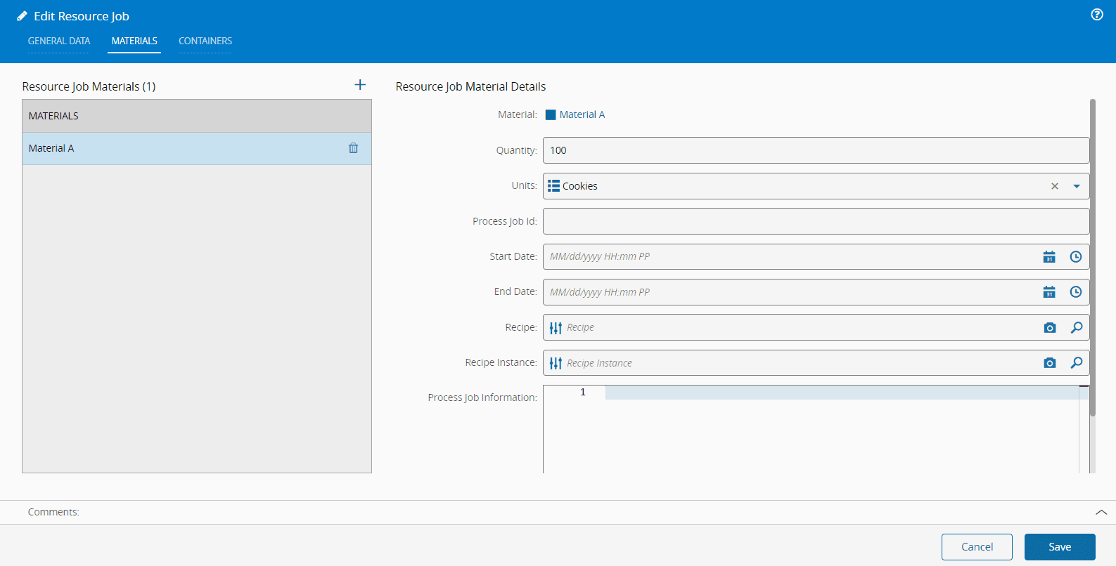In this wizard, you can add, update, or remove Resource Job Materials by selecting the or icons, respectively.