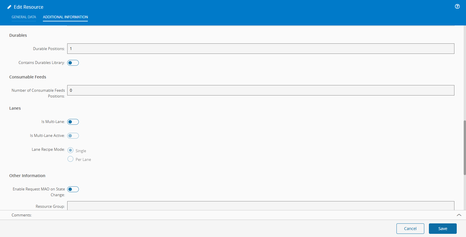 - If existent, the system will present the currently attached Durables at the Resource, organized by Durable Type.