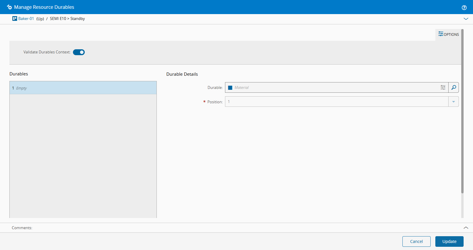 true, it must have a number of Durable Positions greater than zero. - If the Validate Durables Context (see below) flag is active, the system will validate whether the Durable to be attached is valid for Resource-Position, that is, the MaterialDurablesContext Smart Table resolution results in at least one BOM of Scope Durables that has a matching BOM Item Product and Position. In addition, if the Step is defined in the BOM Item, the Durable must be in that Step otherwise the operation will not be possible.