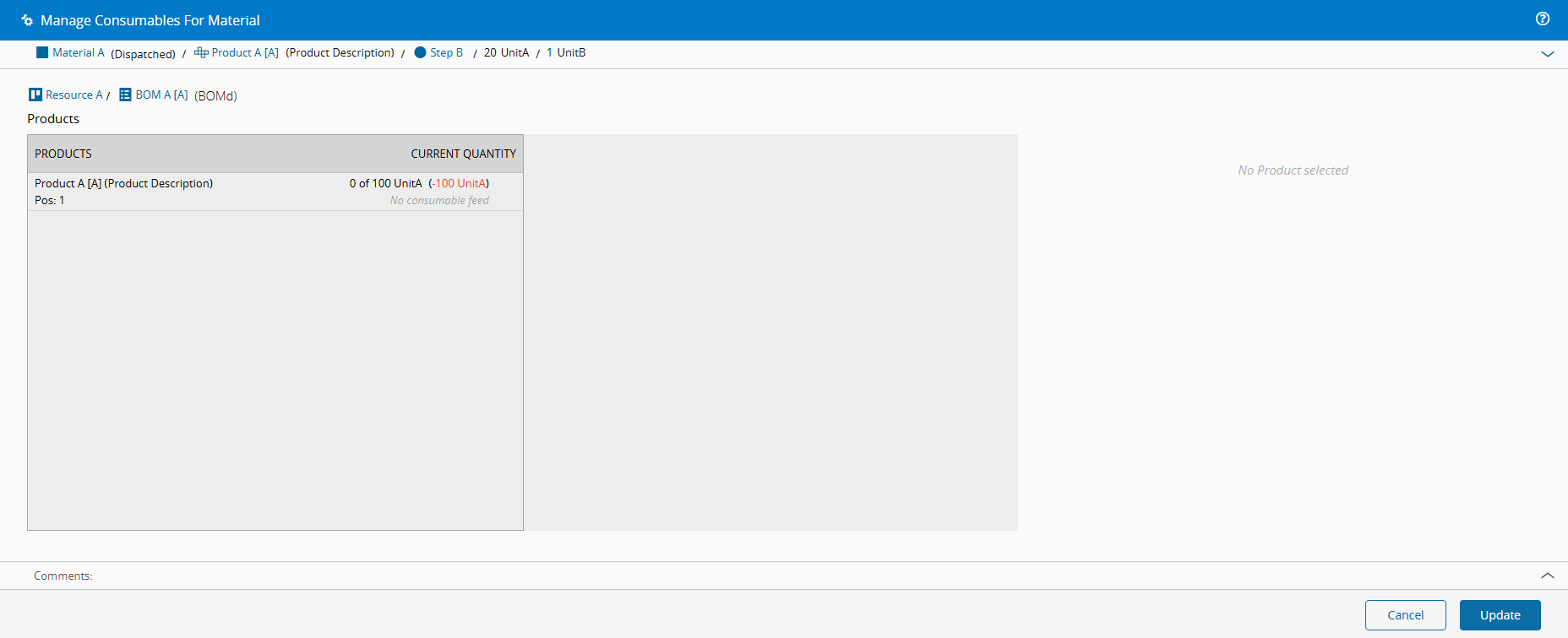 If you select Consumables without selecting a Material, the Manage Consumables operation is called.