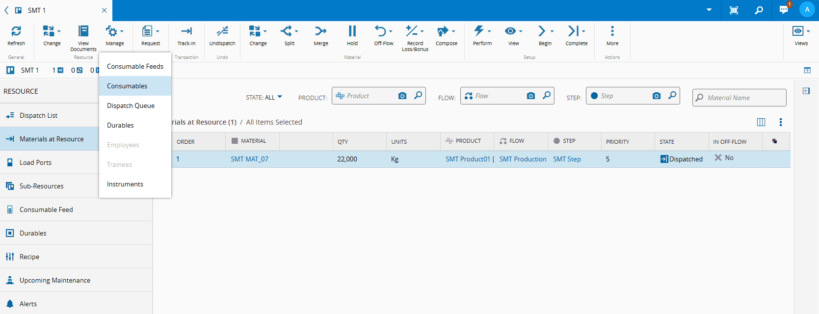 This operation allows you to Manage the Material Consumables at a particular Resource.