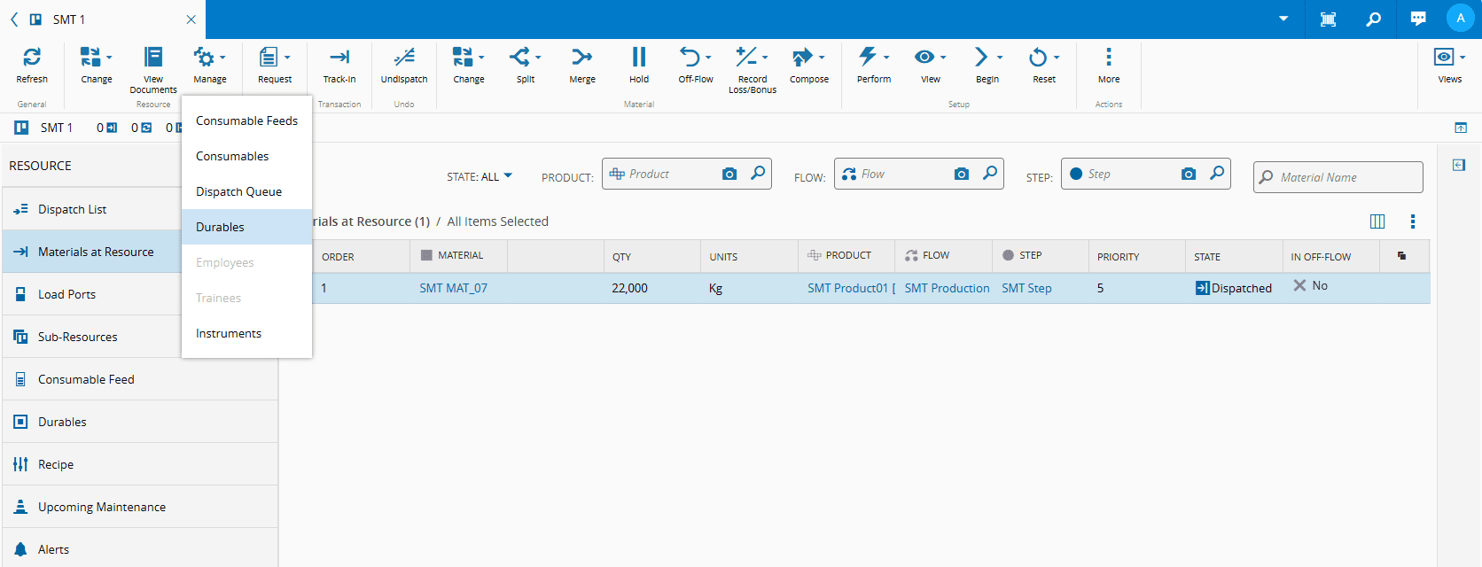 This operation allows you to Manage the Material Durables at a particular Resource.