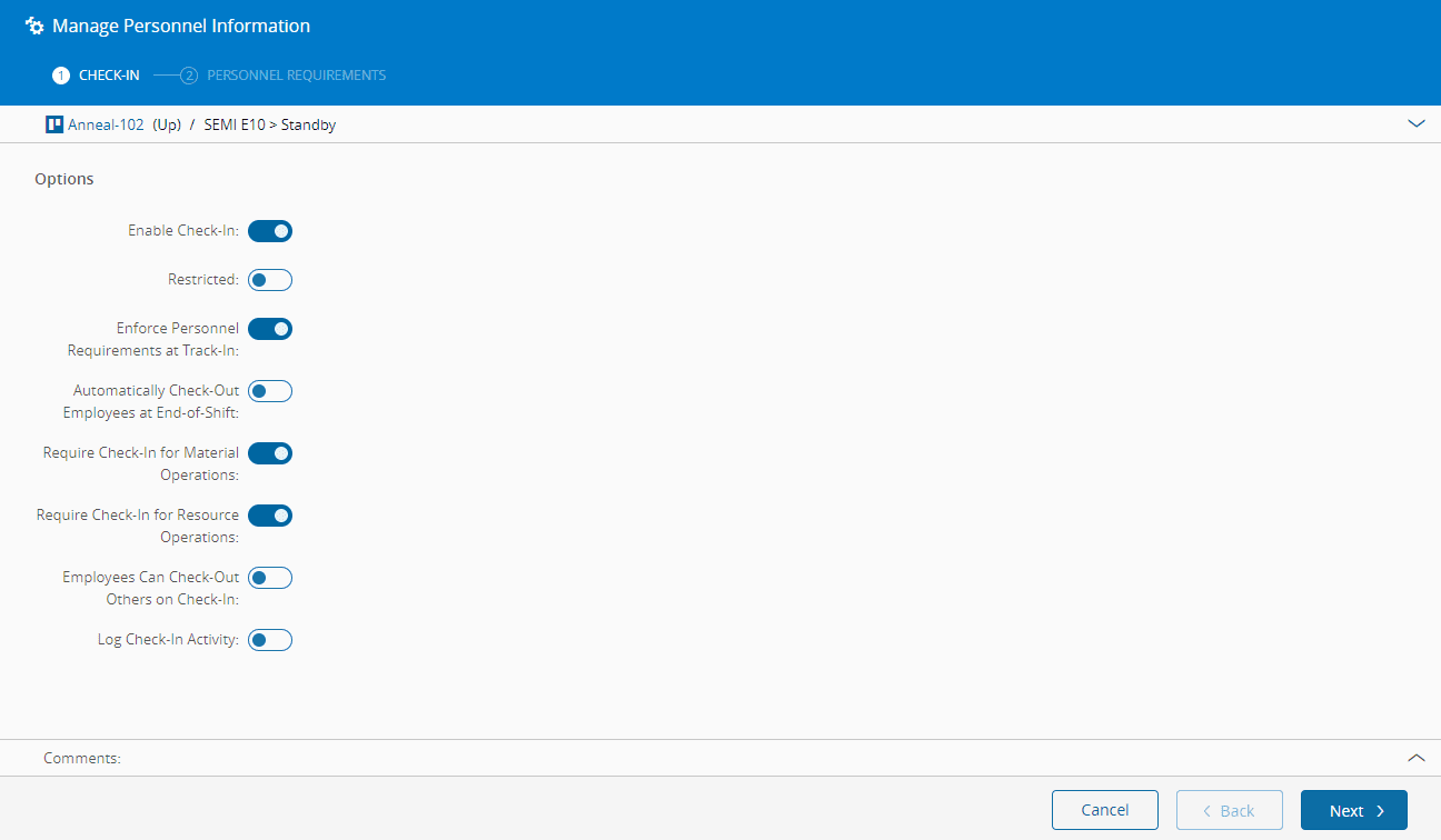 true, the user will then have to select the position in which he is checking-in. - Enforce Personnel Requirements at Track-In - when performing Track-In, the Employee will be asked for confirmation on Certifications and Qualifications.