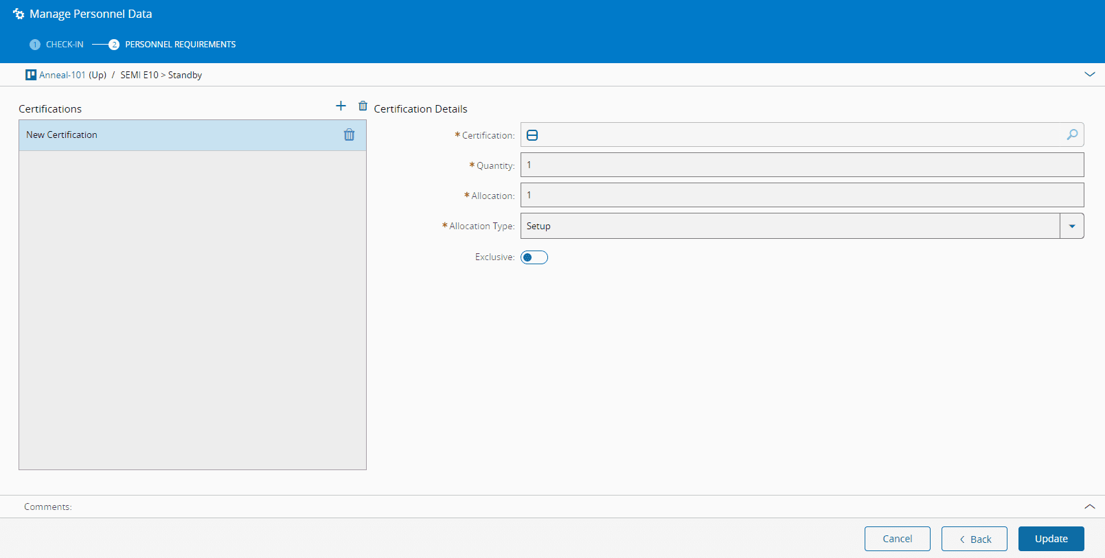 This operation is used to manage Personnel requirements, i.e, Employees' Certifications and Check-In and Check-Out information.