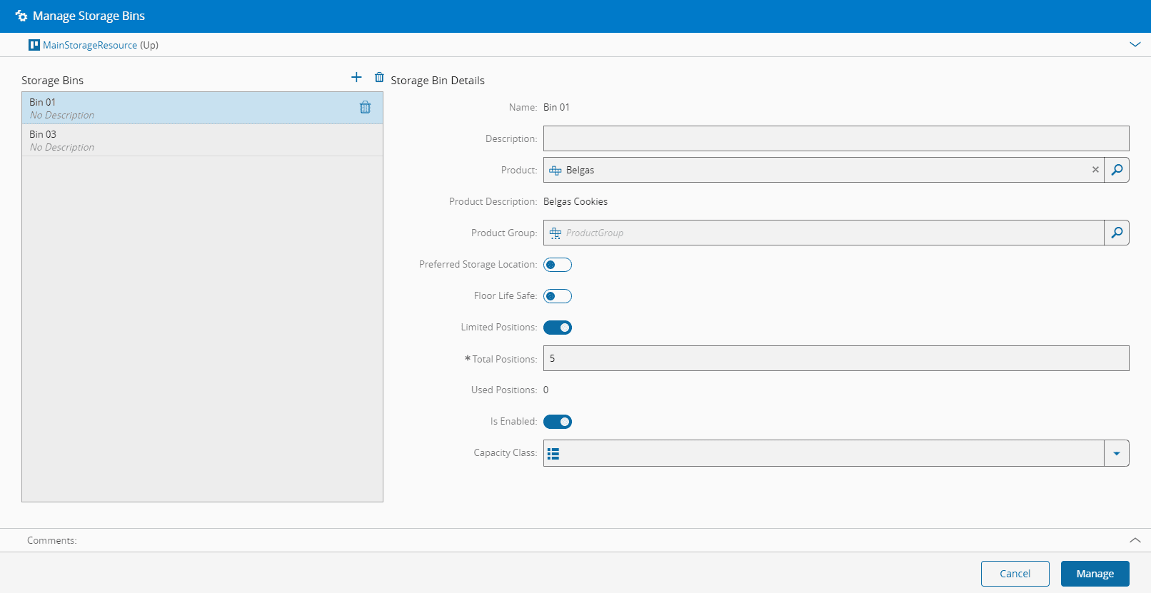 - Define whether the bin has limited positions. If so, define the number of Total positions. The number of Used positions will be displayed automatically.