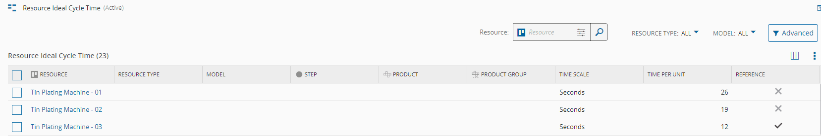 - The ResourceIdealCycleTime smart table must be filled in with the appropriate values for your production environment. For each combination of Product per either Resource, Resource Type or Resource Model, define: