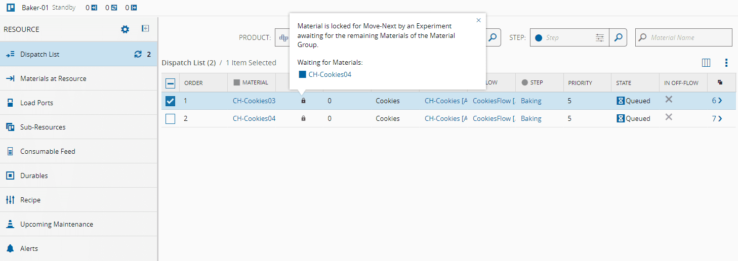 When a Material is waiting for an Experiment in the Resource, a lock badge will appear in the column next to Material. Selecting it will display a pop-over message, as shown in the image below.