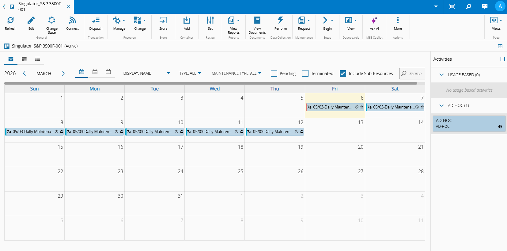 The Maintenance view displays information on the Resource scheduled Maintenance Activity Orders.