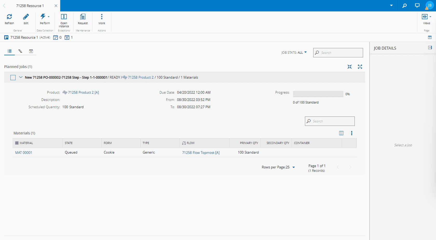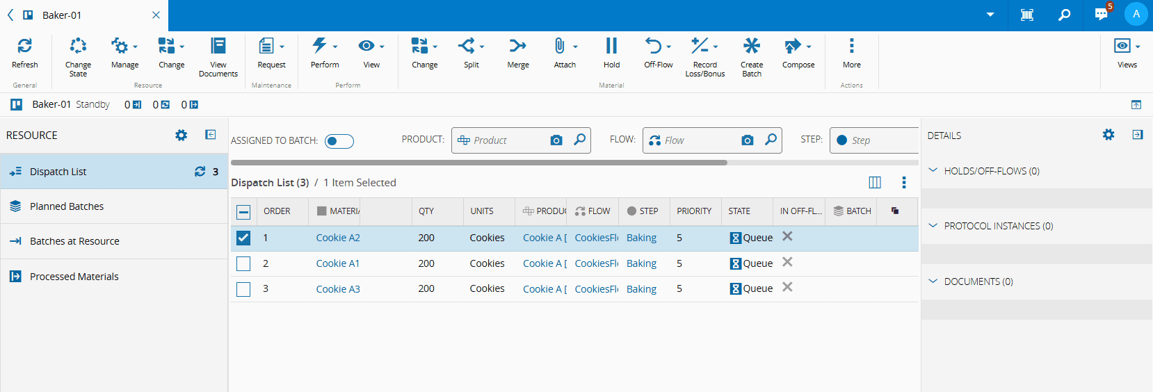 • Planned Batches - shows the Batches available for release at the selected Resource. It also shows the Batch Materials that are associated with a given Batch. These Batches will be in the Created state. When selecting one or more Batches, some of the buttons in the action bar will be enabled, allowing you to perform different operations.