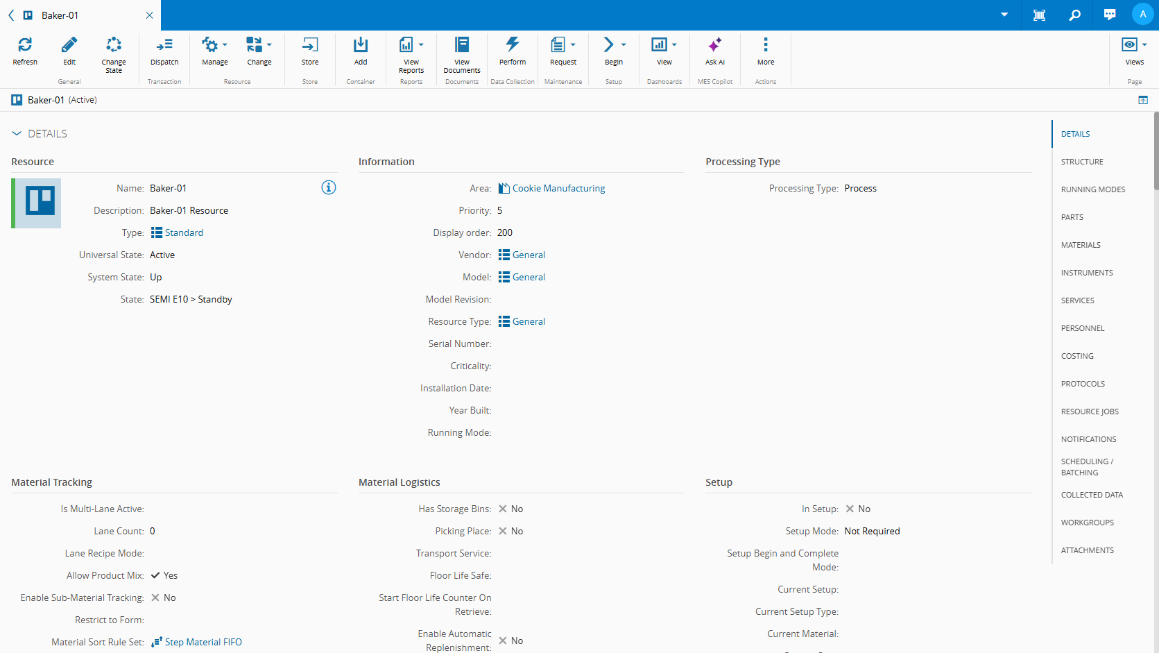 • Batch at Resource - shows a list of the Batches In Process state. Among other operations, you may Track-Out or Abort a given Batch.