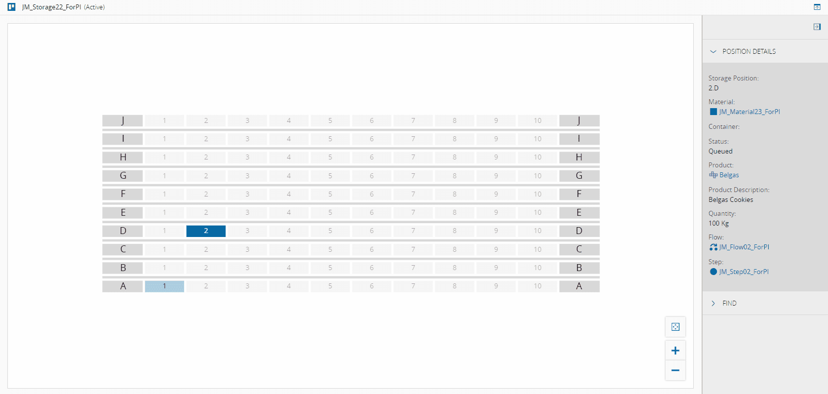 For Resources of Processing Type Storage, a top-down view of the Resource is made available to you, displaying all the storage positions of the Resource, including information on the stored Materials or Containers for each position. You can zoom and drag the visualization and select each of the positions that are shown in grid form, with matrix-like indications of the storage positions.