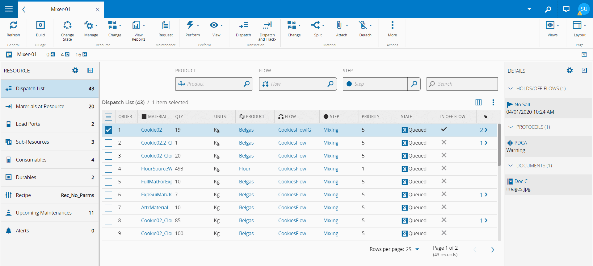 • Dispatch List - shows the available Materials for dispatching at the selected Resource. These Materials will be in the Queued state. When selecting one or more Materials, by ticking the respective checkboxes, some of the buttons in the action bar will be enabled, allowing you to perform different operations.