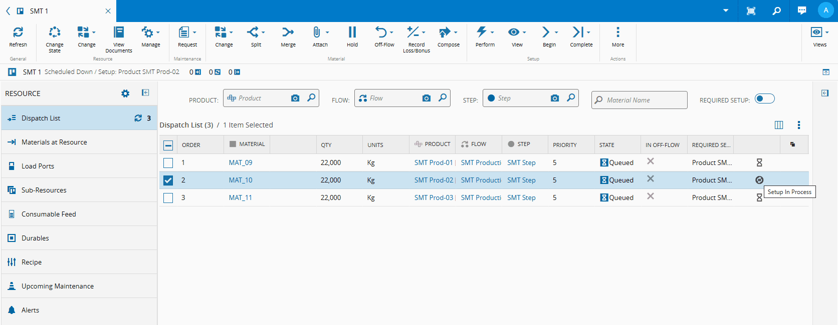 The Resource View shows an overview of the available Materials for processing at the selected Resource in the Dispatch List tab which includes only Materials in state Queued. In the Materials at Resource tab, the system displays all the Materials which are currently associated with the Resource. The total number of Materials in each of these states is shown alongside the Resource Name and State.