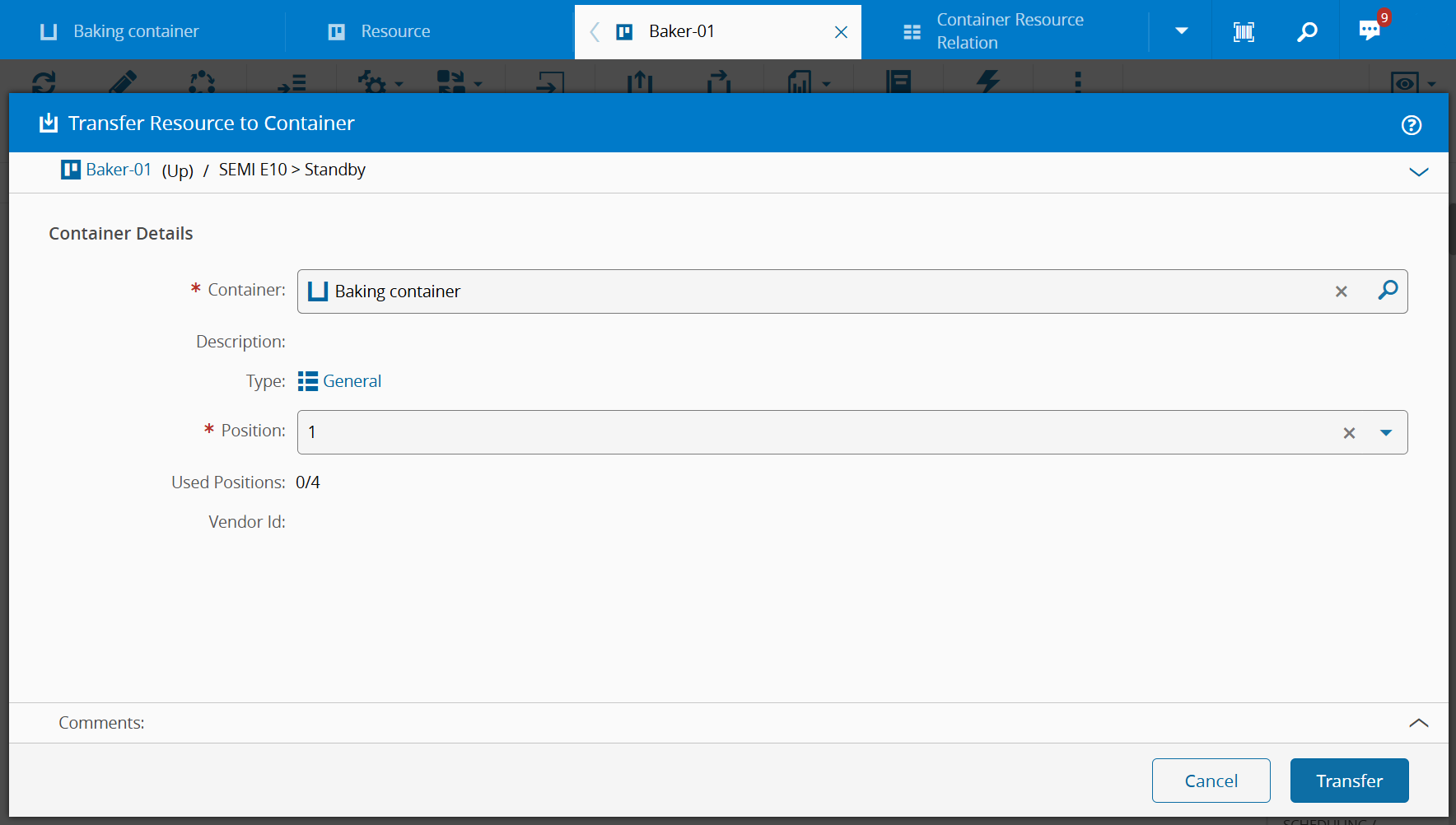 2. On the top ribbon, select Transfer Container.