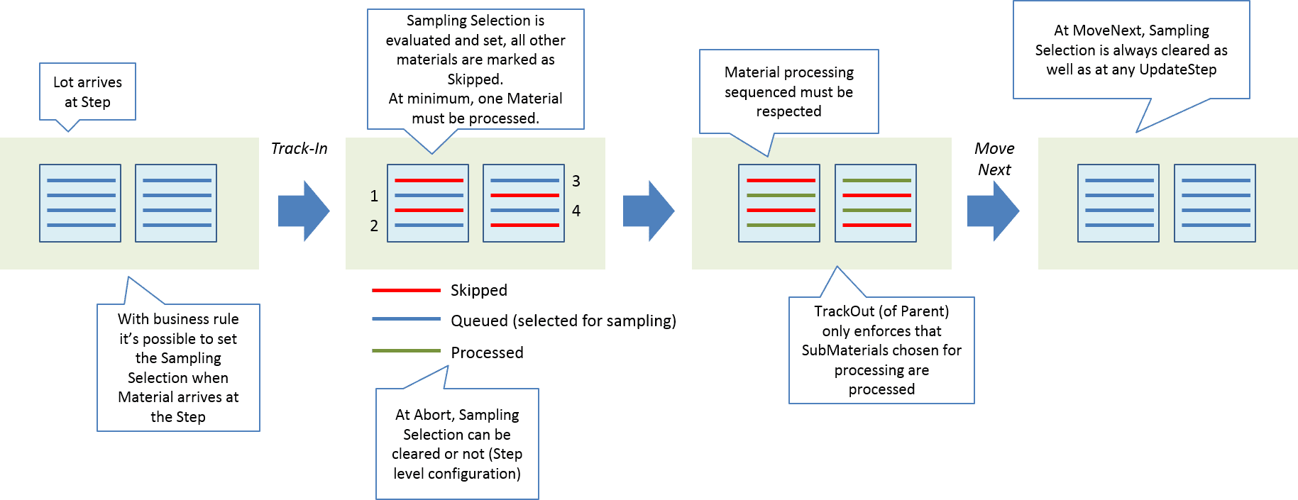 A Sampling Pattern can be used as a business rule prior to Track-In, in which case it is preserved at Track-In or it can be set at Track-In, Sampling Patterns are configured at the Step level. At the Step level, it is also possible to configure whether the sampling Selection is cleared on abort or not.