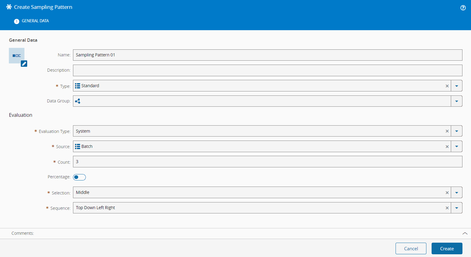 - Select the Sampling Pattern type. The list of possible values is taken from the SamplingPatternType Lookup Table.