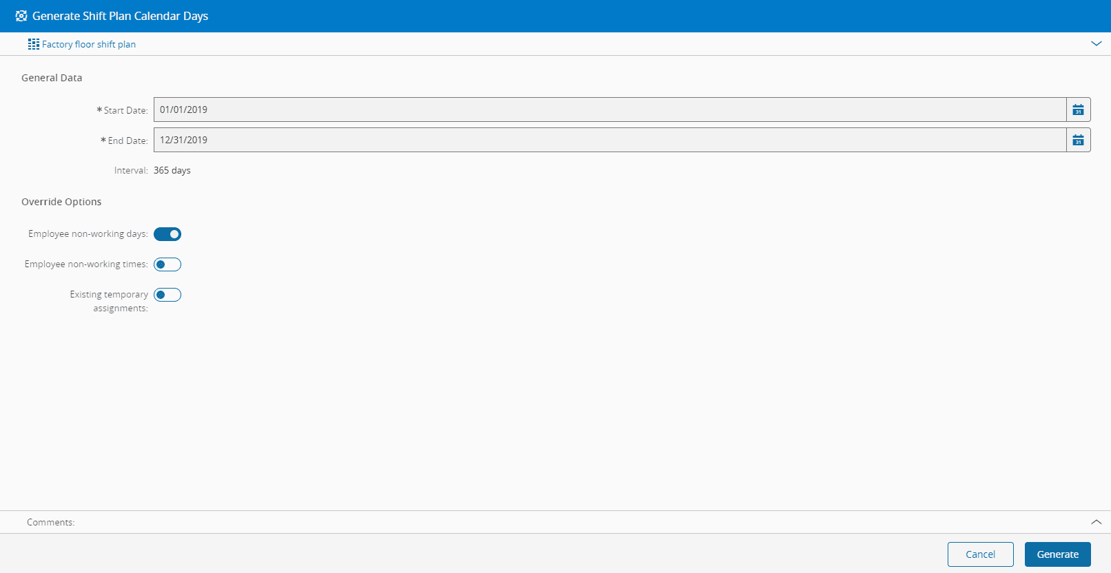 The Generate Shift Plan Calendar Days wizard can be called from the Shift Plan page within the Business Data Group.