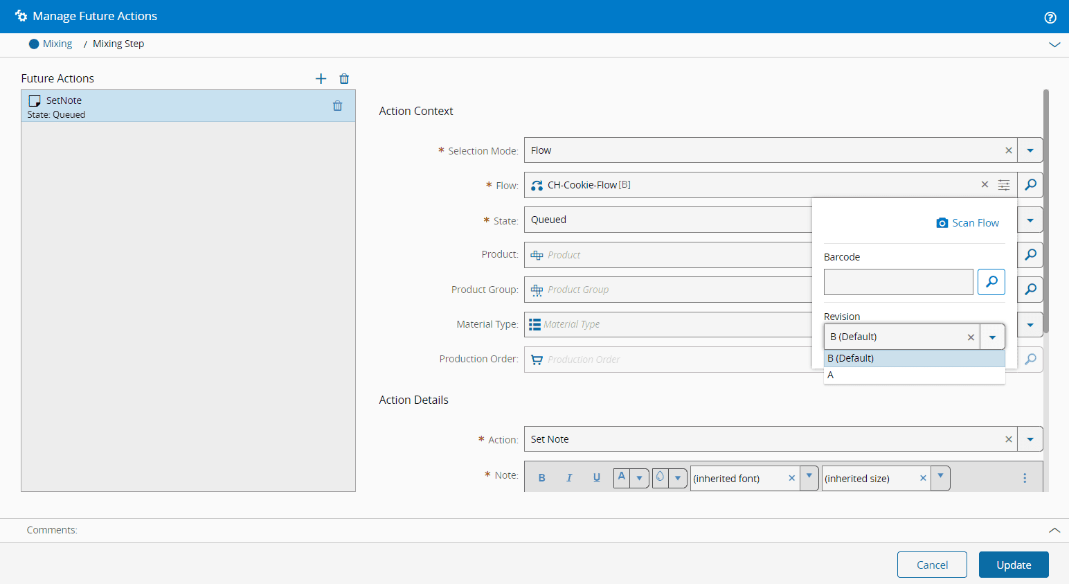 In the Action Context section of Manage Future Actions you can define a Flow, Product or Product Group for a specific revision or for an entity to serve as the context.