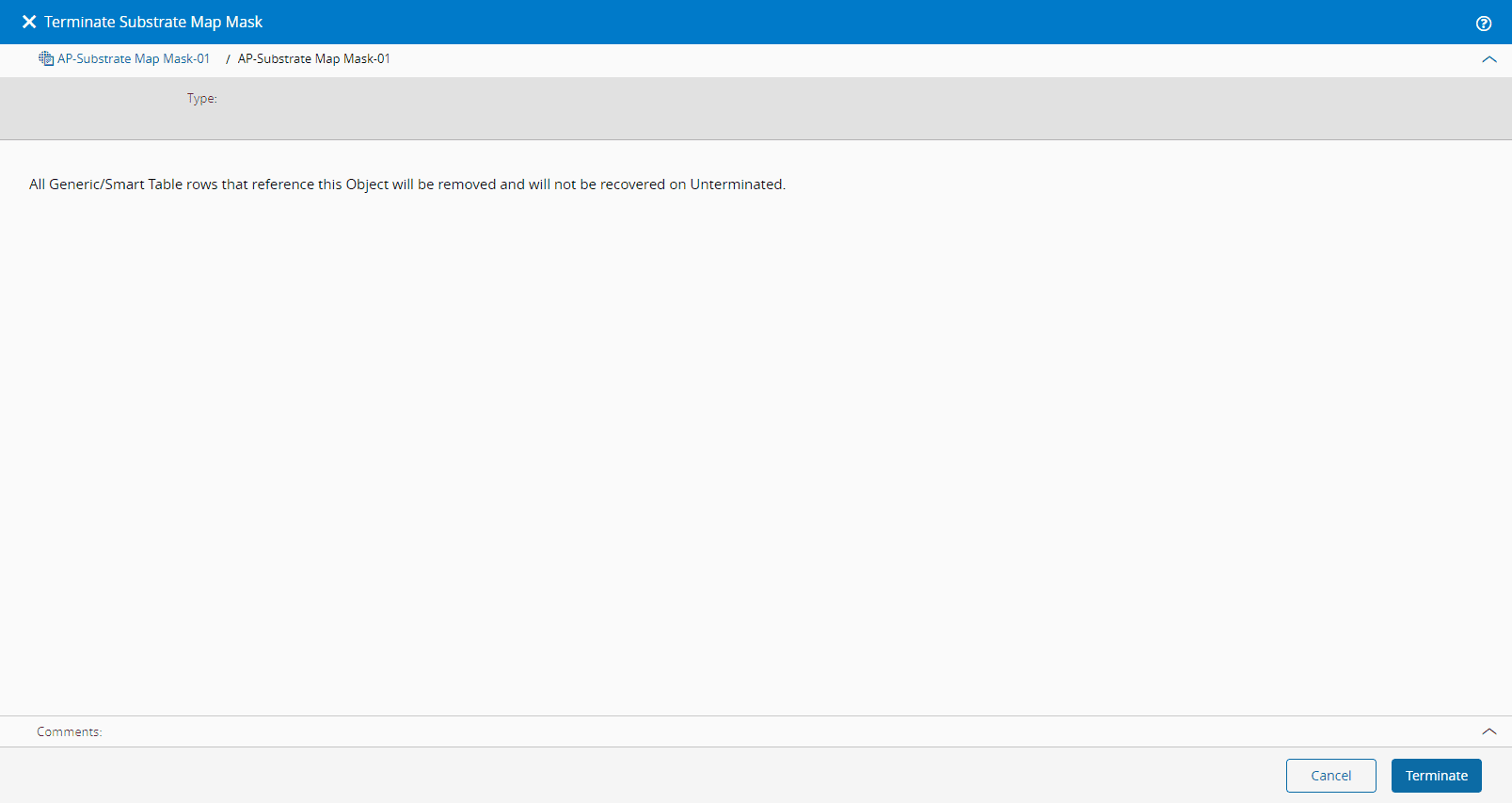 - Select Terminate to perform the operation. All generic/smart table rows that reference the current object will be removed and will not be recovered if the object is unterminated at a later point.