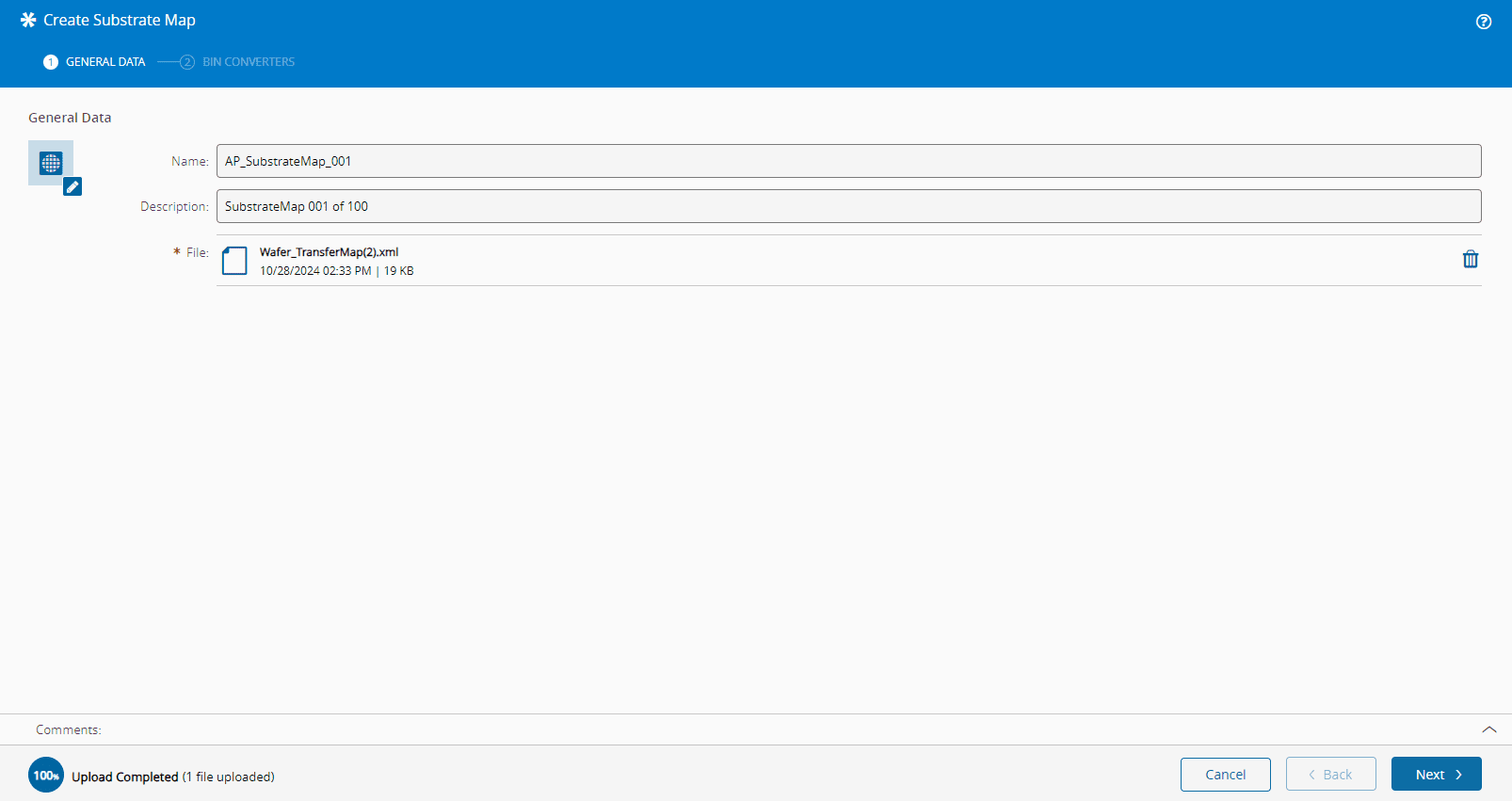 When creating a Substrate Map the system validates that the uploaded file is compliant with SEMI E142.