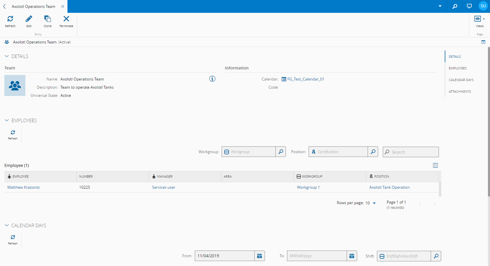 • Calendar Days - displays information on the Calendar Days generated for the Team.