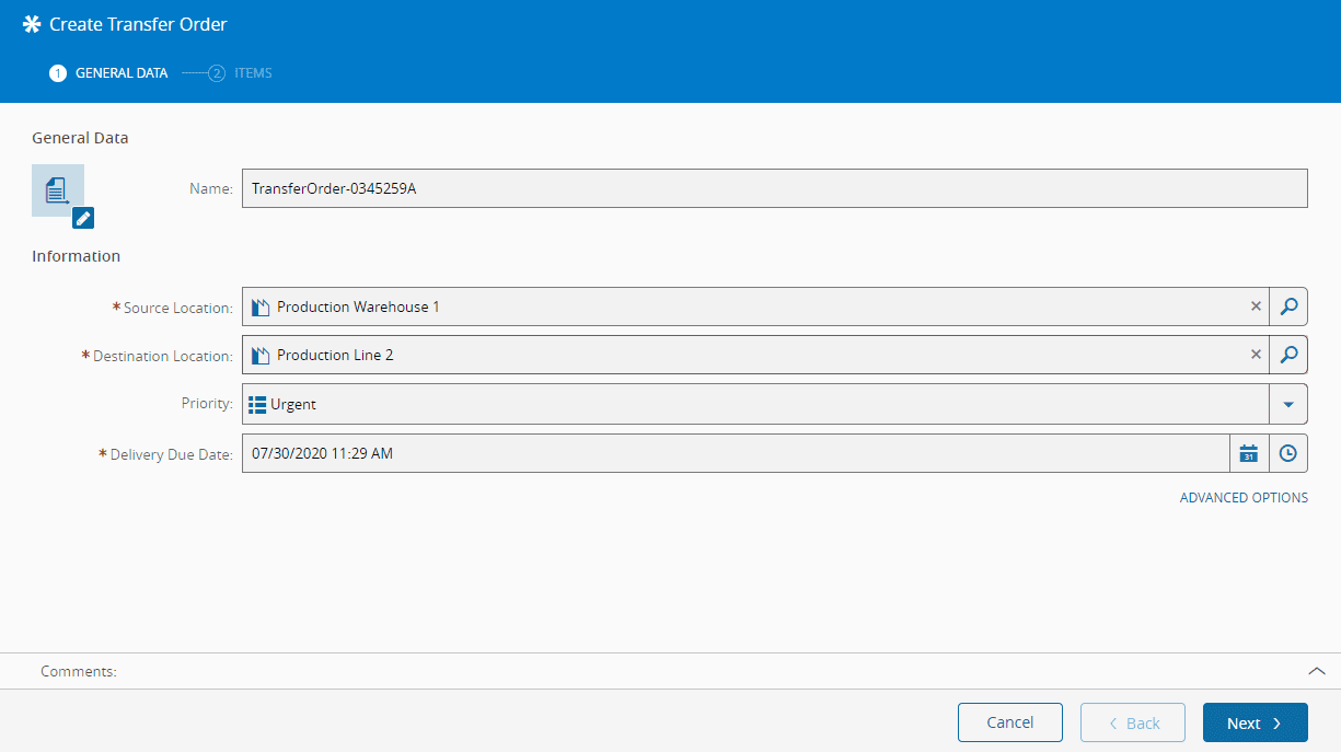 4. Optionally, specify additional information for the Transfer Order in the Advanced Options section by selecting: