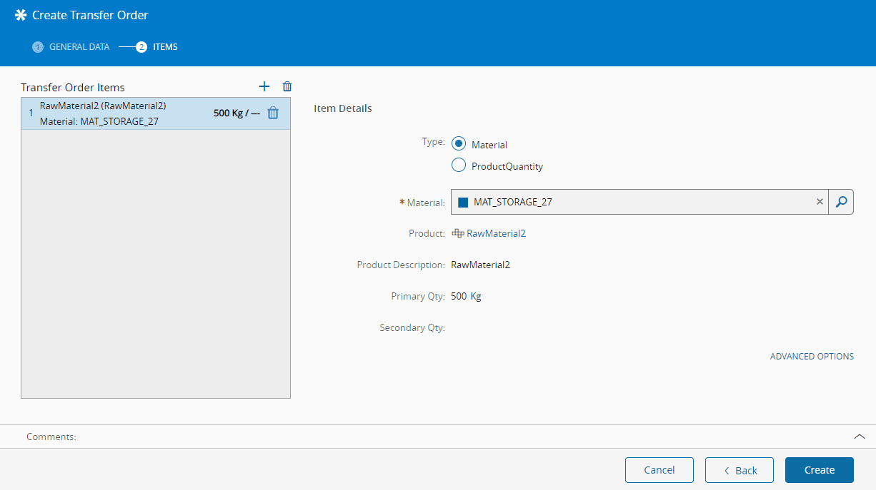 6. Optionally, specify additional context data for the Transfer Order in the Advanced Options section by selecting: