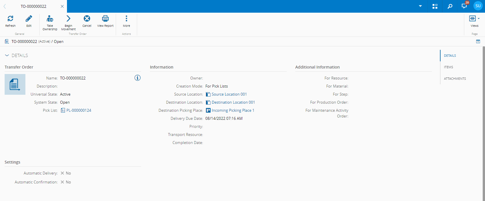 The Transfer Order page displays general information on the specific Transfer Order. In addition it enables the user to perform all the operations that can be performed on a specific Transfer Order.