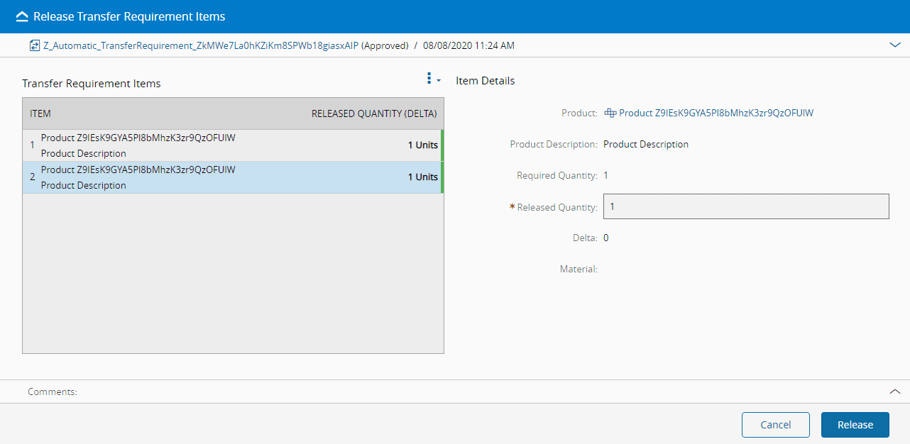 3. If the Transfer Requirement Enable Partial Release is false, the whole Transfer Requirement must be released, however if Enable Partial Release is true, select the Released Quantity for each Transfer Requirement Item.