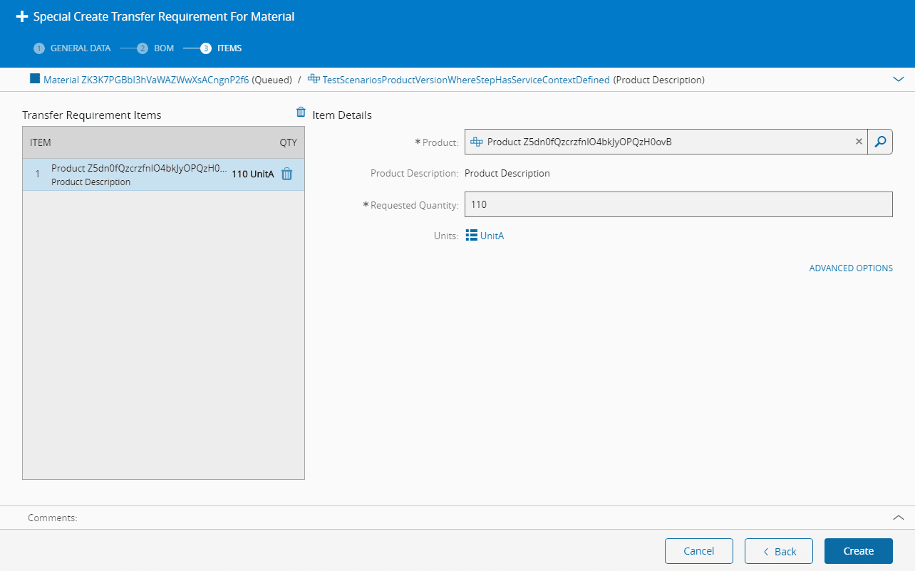 This operation is used to create a new Transfer Requirement for a specific Material using a selected BOM context.