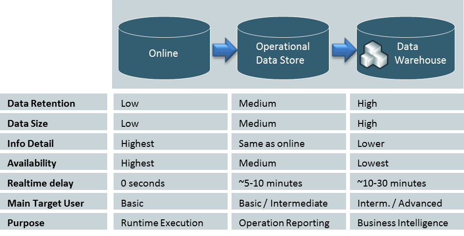 The online database contains the runtime data up-to-date. There is a delay of some minutes before the data is replicated to the Operational Data Store (ODS). The Operational Data Store contains all the online database in a non-aggregated from and it is the primary source of reporting. Once or a few times per day, the Operational Data Store data is aggregated into the Data Warehouse. Therefore, it is possible that, when checking data in the ODS, the user will see immediately the changes that occurred in the online database. Also, the Data Warehouse reports will only contain aggregated data after the ODS aggregation job has been run, which typically occurs one or a few times per day.