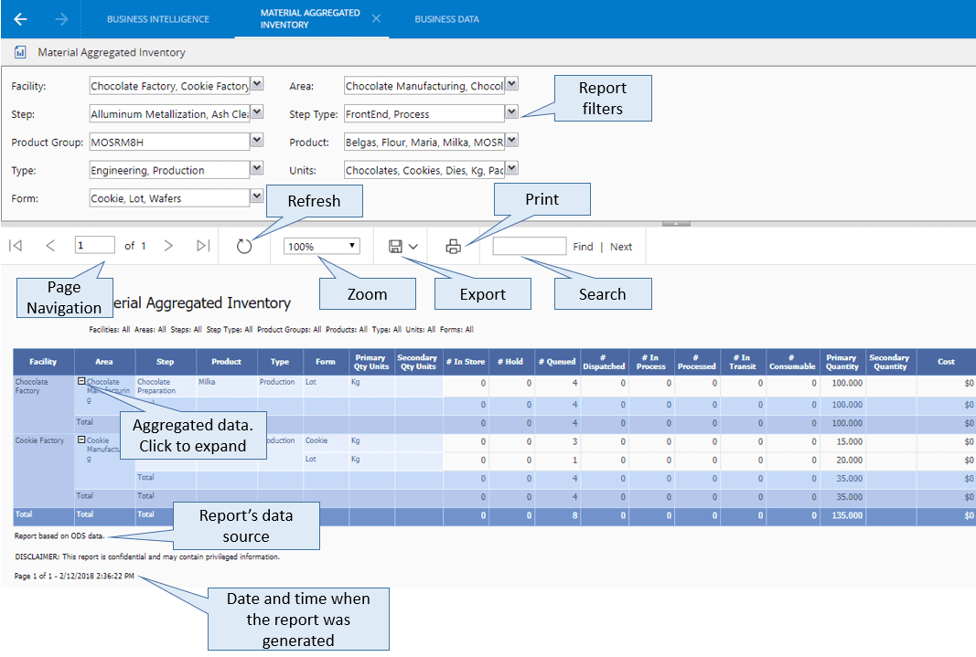 - Material Aggregated Inventory - This report displays aggregated information about the current material in progress.