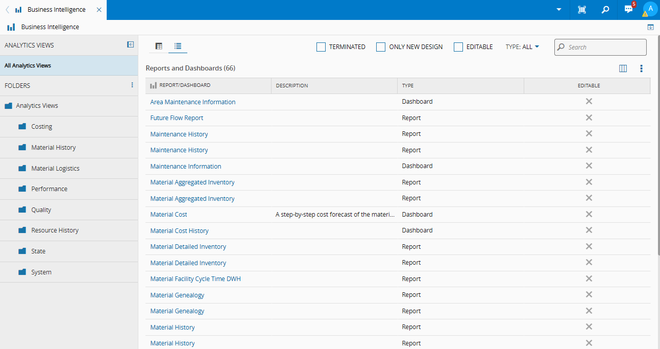 You can refine the displayed results using filters such as Terminated, Only New Design, and Editable. The Type filter allows you to display only Reports, only Dashboards, or all available views.