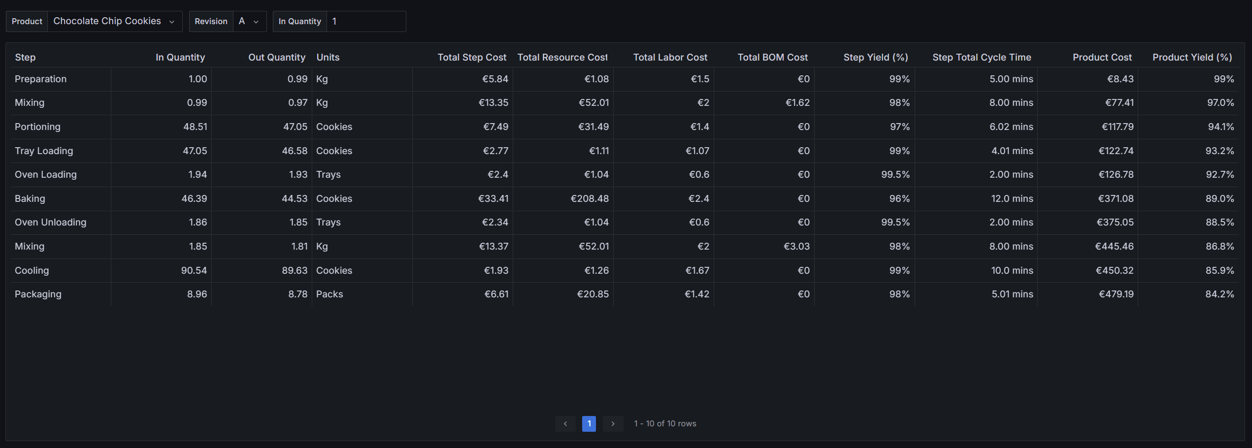 In Quantity The quantity entering the Step. 1st Step: user-defined input Subsequent Steps: Out Quantity (previous step) × Unit Conversion Factors CostResolutions table in DWH