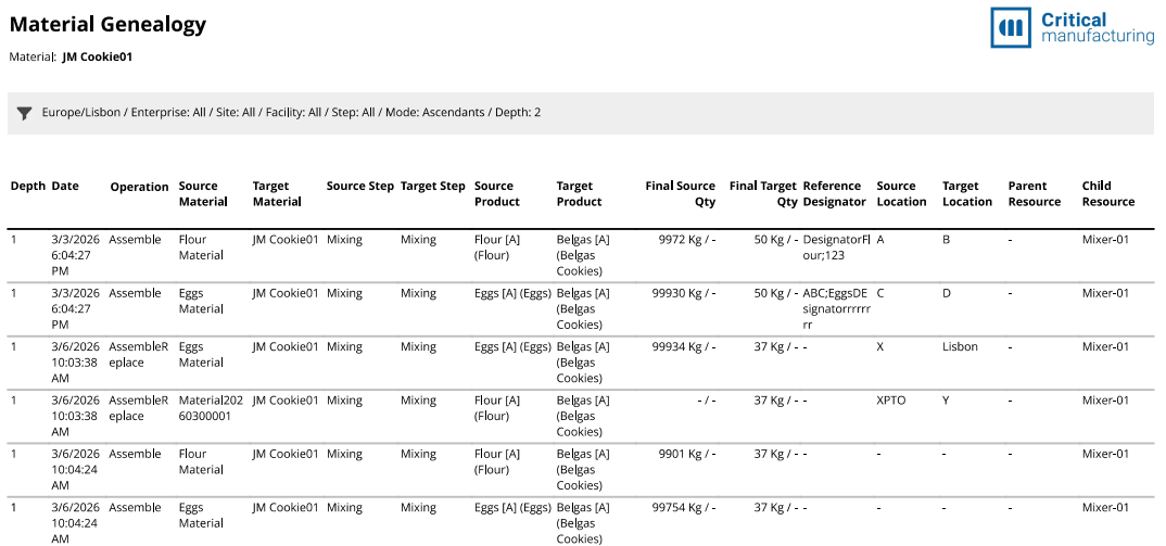 This report provides information about the parent and child Materials for the selected Material. It enables tracing how materials were split, merged, or assembled throughout production.