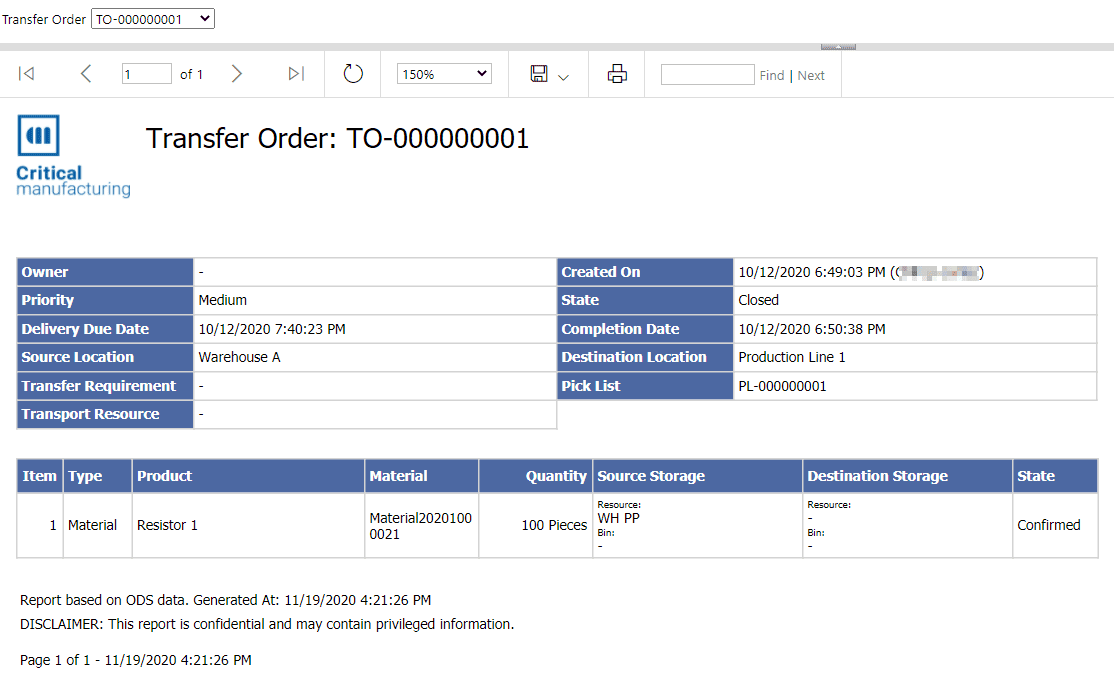 - Created On - Date of creation of the Transfer Order
