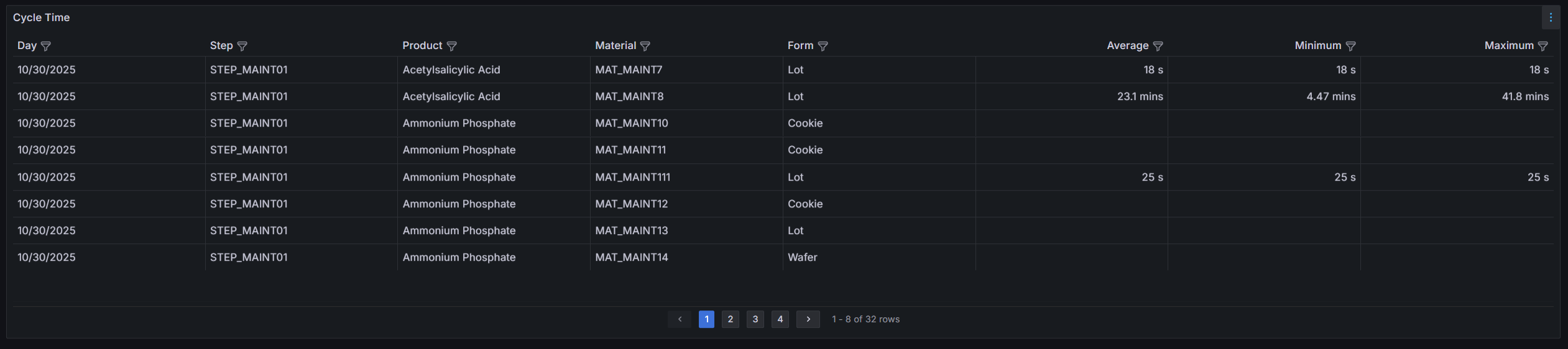 | Cycle Time Table | Tabular view showing per-day cycle time statistics (average, minimum, maximum) by step, product, and material form. | N/A | material_movement from Material Cube |
