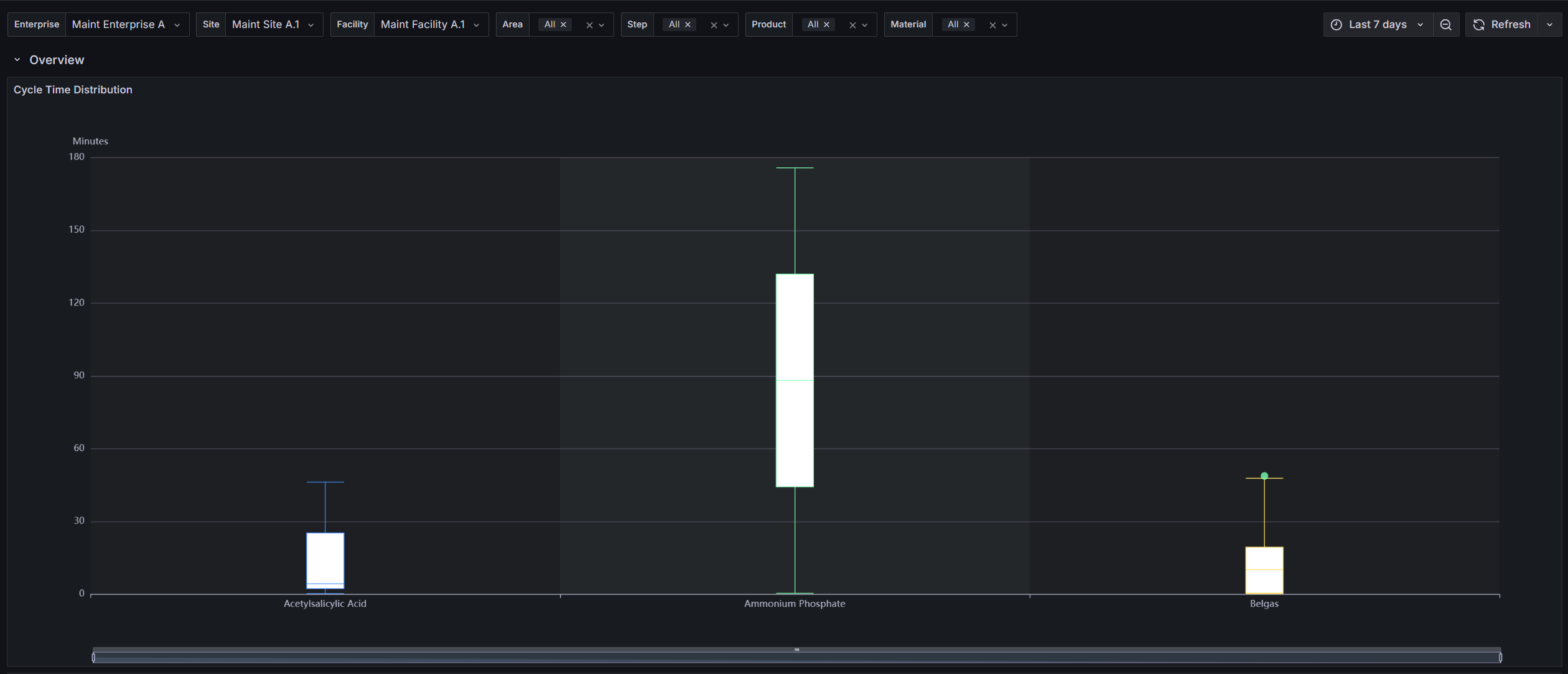 | Cycle Time Distribution | Boxplot showing cycle time distribution per product, with median, quartiles, and outliers. | Outliers are highlighted as scatter points. | material_movement.cycle_time from Material Cube |